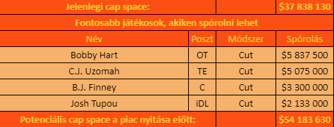 Aztán itt van a támadófal kérdése, ahol Jonah Williams kivételével mindenki átlag alatti játékos és akár ki is lehetne őket vágni, de hiába mondjuk, hogy helyettük akár egy darab fa is védhetné Burrowt, ez nyilván költői túlzás. Mindenesetre elgondolkozhat ezen a csapat, főleg Bobby Hart esetében, ahol több mint 5 millió szabadulna fel, de cserének akár maradhat is. A cserék ellenben már elküldhetőek, B.J. Finney például szinte beragadt pénz nélkül megoldható.