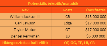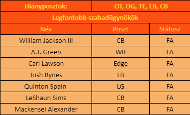 A Bengals soha nem volt tényező a szabadügynökpiacon, egyrészt mert a csapat nem igazán szeretett költekezni, másrészt a játékosok számára sem volt annyira opció ide szerződni, mert nem volt semmi vonzó a franchise-nál. Ezúttal azonban minden megváltozhat, mert Burrow draftolásával nagyon úgy tűnik, hogy megtalálták a csapat arcát és ez egyrészt azt jelenti, hogy néhány szabadügynök el tudja majd képzelni, hogy itt folytassa, másrészt a csapatnak is mindent meg kell tennie, hogy az üdvöske jól érezze magát.
