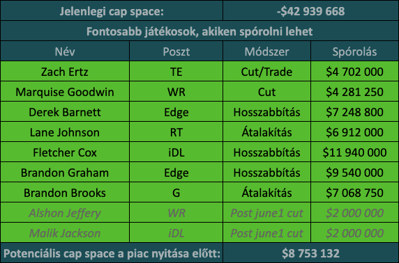 Zach Ertzről régóta tudvalevő, hogy nem marad a csapatnál, és Marquise Goodwin is felesleges ennyi pénzért, még akkor is, ha cserélt érte tavaly a csapat, de az opt outolása miatt pályára sem lépett zöld-fehérben. Ertz esetében meg lehet próbálni a cserét, de az csak a ligaév kezdete után íródik jóvá, habár a többi lépés kimaxolásával akár bele is férhet. Bármit kap érte a csapat, már megérte. Ezzel a két kivágással tehát $9 millióval van beljebb az Eagles.
