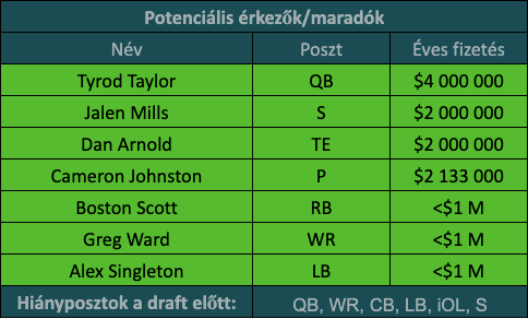 Jelen pillanatban csak a Saints van nagyobb mínuszban a fizetési sapkát tekintve az Eaglesnél, hiszen a Sasok 43 millió dollárral vannak a plafon felett. Ráadásul a szerződéseik nagy része nem is túl rugalmas, kivágható játékosból is alig van, szóval minden “mágiát” be kell vetni, hogy egyáltalán beférjen a csapat a plafon alá március 17-ig. Persze olyan nincs, hogy egy csapat ne férne be a sapka alá, így az Eagles is meg fogja tudni ezt oldani, csak hát ehhez ismét a jövőből kell erőforrásokat kölcsönözni. Arról pedig álmodni sem lehet, hogy idén bármiféle igazolásokat eszközöl a gárda (habár azért 1-2-t csak beszuszakoltam a cikk végén).