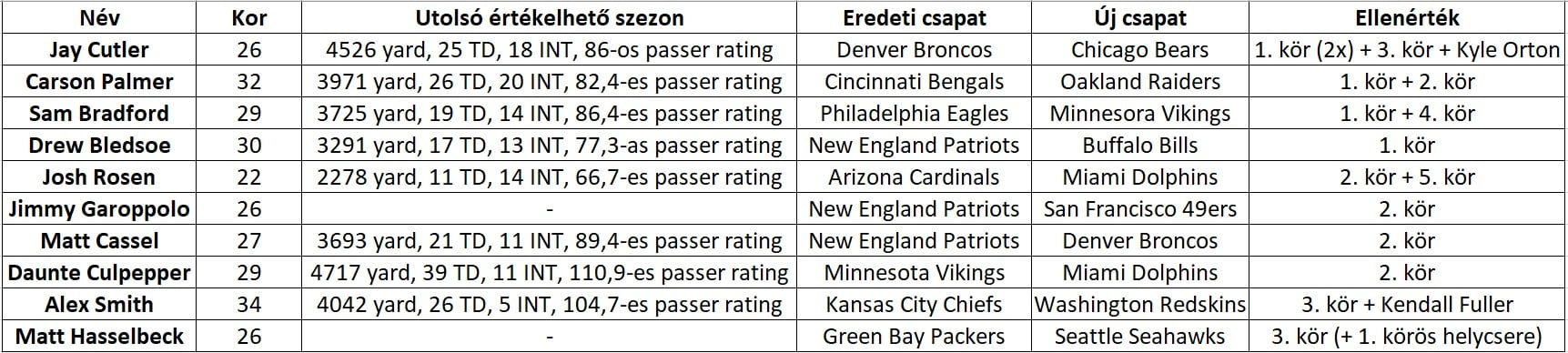 Egy kezünkön meg tudnánk számolni, hány komolyabb, legalább egy első körös picket magába foglaló QB-csere volt a 21. században: Drew Bledsoe, Jay Cutler, Carson Palmer és Sam Bradford. Egy kicsit jobban állunk, ha kiszélesítjük a kutatást és a második/harmadik körös ellenértékeket is belevesszük az egyenletbe, így Matt Cassel, Jimmy Garoppolo, Alex Smith, Josh Rosen, Matt Hasselbeck és Daunte Culpepper is bekerül a képletbe.