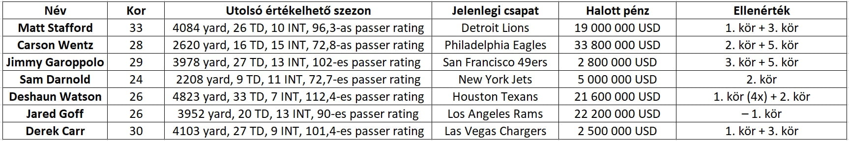 Az utóbbi időben nyolc szerződés alatt álló irányító elcserélése merült fel komolyabban: Matt Stafford és Deshaun Watson cserét kért a csapatától, Jared Gofftól szabadulni akart a Rams és reálisan nézve hasonló a helyzet a 49ersnél Jimmy Garoppolóval is. Sam Darnoldról csupa jót mondott Robert Saleh, de mivel a Jets az egyik favorit Watson megszerzésére, ráadásul a top 3-ban választ a drafton, így alighanem Darnold sorsa is megpecsételődött. Továbbá ott van még Carson Wentz, aki Doug Pederson kirúgása ellenére is távozhat Philadelphiából, de állítólag Derek Carr és Marcus Mariota iránt is vannak érdeklődők (utóbbival külön nem foglalkozunk, legjobb esetben is egy 4-5. körös ellenértéket kaphat érte a Raiders).