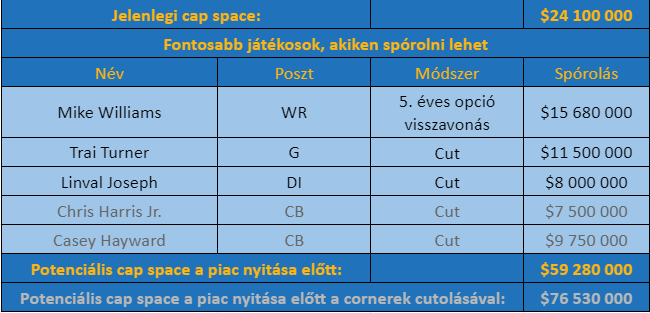 Mivel rengeteg játékos szerződése futott ki 2021-re, viszonylag kevés olyan fizetést találunk, amivel spórolni tudna a csapat. Az évet 24 millió dollárral kezdhetik meg, de a szabadügynök piacra akár 50-65 millióval is fordulhatnak majd. Mike Williams opcióját szerintem vissza fogja vonni a csapat. Ez nem jelenti azt, hogy ne szerződhetnének vele újra akár már idén, én ezt fogom tenni, de egy évre fixen 15 milliót nem biztos, hogy érne. Az elmúlt 3 év mindegyikében bizonyította, hogy minőségi második számú elkapó tud lenni Keenan Allen mögött, de ezt inkább egy új, jól struktúrált szerződéssel kéne honorálni, ahol hasonló éves átlagot úgy lehet elosztani, hogy ne 2021-ben foglaljon a legtöbbet a sapkából.