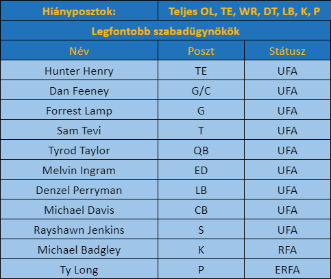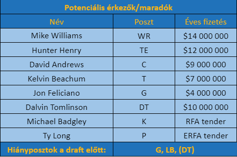 A keretben rengeteg kezdő játékos szerződése jár le, akik közül akadnak jó, de könnyen elengedhető minőségűek is. A Chargers 2020-as szezonja jól rávilágított, hogy a rosteren bár vannak tehetségek, a bennük rejlő potenciál nem feltétlenül lett kihozva. A keret egyben tartása és a kritikus helyeken lévő megerősítése az első számú feladat, hogy kihozhassák a maximumot a Herbert projektből.