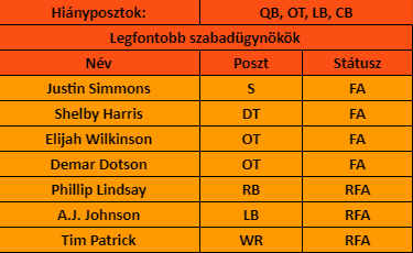 Elkezdhetném írni a szokásos bevezetőt, hogy megrekedt a csapat, amely nem jó, de legalább esély sincs rá, hogy jó legyen a következő pár évben, de már úgyis tudjátok a szokásos mantrát, amit nem hisztek el, majd amikor 5 és 15 közt húz valahol a gárda, akkor nem lepődik meg igazán senki. Az egyetlen dolog, ami más lesz az idei holtszezonban, mint az eddigiekben, hogy úgy tűnik irányítót most nem fog keresni a gárda, maximum egy veteránt Lock mögé/mellé. Ami kicsit felkavarhatja az állóvizet, hogy elviekben John Elway helyett George Paton lett az új general manager, de korlátozott lehetőségekből nehéz csodát tenni.
