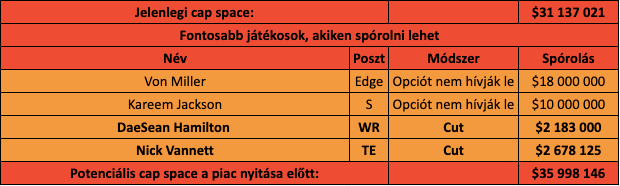 Persze némi aprót össze lehet szedni a resztlin is, például Nick Vannett kivágásával több mint 2.5 millió dollár folyna be minimális halott pénz mellett, de a közepesnél is rosszabb tight endekre valamiért gerjed a vezetőség. Mellette még Mike Purcelltől vagy DaeSean Hamiltontól is meg lehet válni, de még ha minden ilyen kisebb kaliberű játékost is elküld a gárda, akkor sem lehet 10 millió dollárnál többet összetalicskázni. Mivel a roster tele van fiatalokkal vagy olyan játékosokkal, akik nem nagyon fognak lemondani pénzről csak azért, hogy itt maradjanak, így strukturálásokkal sem lehet játszani. Amiről itt még mindenképpen említést kell tenni, hogy a csapat idény közben hosszabbított a bal oldali tackle-el, Garrett Bollesszal, aki viszont az első évében csak 5 millióval terheli a házat, azt pedig majd az idő eldönti, hogy az első értelmes szezonja után mekkora kockázatot vállaltak. Így legjobb esetben is körülbelül 50 millió dollárja lehet a gárdának.