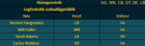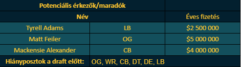 Tyrell Adams talán még ennyi szót sem érdemel. Elsősorban a sérülések miatt került a kezdőbe, ahol aztán igazi tackle gyáros volt néhány mérkőzésen, de rendre későn ért oda vagy elkapást engedett, ezért vétette észre magát. Nem gondolnám, hogy magasan van az ára, 1-2 millió dollárért vissza tudják valószínűleg szerezni és ha elküldik McKinney-t, akkor meg is tehetik. A többi lejáró szabadügynök már nagyon a rotációs játékos kategória és senki sem olyan értékes, hogy versenybe kelljen szállni értük. A korlátozott szabadügynökök egy része visszatérhet, de nem számítok nagy hosszabbításokra a csapat részéről.