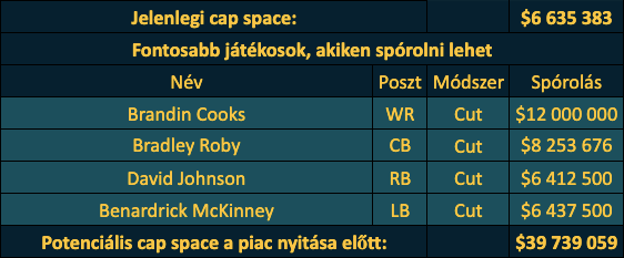 Talán haladjunk olyan sorrendben, hogy milyen sok pénzt szabadít fel a gárda, mert minden kivágás mellé lehet illeszteni egy kontra érvet is. Az első név a kalapból Brandin Cooks, aki talán Hopkins távozása után az elsőszámú elkapónak tekinthető, de ha 12 millió dollárt lehet vele spórolni halott pénz nélkül, akkor meggondolandó, hogy megváljanak tőle. Szintén emellett szól, hogy Cooks szinte sehol nem tudott igazi WR1 lenni, mert ugyan több helyen is az első volt a sorban, de képességeit tekintve soha nem volt nevezhető a liga top20 elkapója közé. Azonban ha őt elküldik, akkor szegény Watson alatt kíméletlenül aprítják a fát, főleg mivel a csapat második számú elkapója, Will Fuller meg szabadügynök lesz.