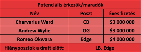 A védelem továbbra is a rendszerre és Steve Spagnuolo szakértelmére fog építkezni, de azért ide nem árthat egy kis erősítés. Ha el tudnak kapni valami olcsóbb passzsiettetőt az nem lenne hátrány, de a pénzszűke miatt semmiképpen nem abszolút kezdőkről beszélünk. A linebacker sorra az eddig tapasztalatok alapján semmi szükség, egyszer költöttek ide sok pénzt, azt is megbánták szerintem. A secondaryben viszont egész biztos, hogy nem tudnak mindenkit megtartani. Breeland helyett kelleni fog egy corner és leginkább egy hasonló felépítésű, hozzáállású játékos, aki kellően fizikális és agresszív. Szerencséjükre a corner piac pont elég mély, esetlegesen valamelyik nagy nevű veteránnal is bepróbálkozhatnak, hátha jönne gyűrűért vagy Jason Verrett vagy Patrick Peterson talán. Az más kérdés, hogy mindkettőben nagy a kockázat.