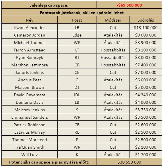 Cameron Jordan, Emmanuel Sanders, Will Lutz, Andrus Peat, Michael Thomas, Malcom Jenkins, Demario Davis és David Onyemata szerződésének átalakításával 41,75 millió dollárt lehet felszabadítani, amivel nemcsak beférne a fizetési plafon alá a csapat, de viszonylag kényelmes helyzetbe kerülne. 30 millió dollár már sok mindenre elég lehet, de nem szabad ebbe túl sok mindent látni.