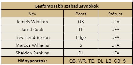 Kezdjük a kivágásokkal. A legegyértelműbb áldozat a tavaly csere útján megszerzett Kwon Alexander: a linebacker sérülékeny, de egészségesen is középszerű, a 13 milliós fizetésének csak a töredékét éri. Az idén 33 éves Janoris Jenkinst sem érdemes marasztalni: tavaly 81,5-es passer ratinget engedett az ellenfelek irányítóinak, ami nem tragikus, de nem is ér 7 millió dollárt.