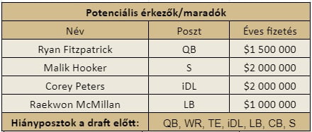 Ettől függetlenül egy irányítót még nem ártana szerezni akár a draftról, akár a piacról. Ez lehetne Winston is, de mivel ő magasabb árkategóriát képvisel, így egy hozzá hasonló, de jóval öregebb gunslinger lehet a befutó. Ryan Fitzpatrick már csak a móka miatt játszik, neki 39 évesen nem derogál 1,5 milliós vetetánminimumért pályára lépni, ráadásul életében először igazán jó csapatban lehetne.