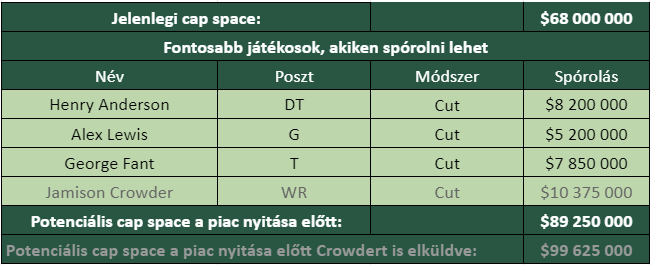 Sam Darnold? Zach Wilson? Justin Fields? Esetleg trade útján Deshaun Watson? Rengeteg lehetőség áll fent és a hírek szerint nem is a következő hetekben fog eldőlni a kérdés. Az azonban most dőlhet el, hogy a mindenkori irányító milyen segítséget kaphat majd maga mellé, mennyire sikerül ezt a nem túl erős és tehetséges keretet megerősíteni a szabadügynökpiacon. A Jets kényelmes helyzetben van, hiszen a csökkenő cap ellenére is markáns 67 millió dollárral kezdheti meg a vásárlást, ami a második legtöbb a ligában. Ezen ráadásul még növelni is tudnak néhány nem túl fájdalmas cut révén.