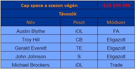 Brockersen kívül tehát nem volt olyan távozója a csapatnak, aki szerződés alatt állt. Az FA-k között is mindössze a Brownsba igazoló John Johnson képviselt top szintet, de mivel a rosteren ott a 2019-ben második körös Taylor Rapp, a tavaly hatodik körös, de egész korrekt szintet hozó Jordan Fuller, illetve a szintén tavalyi 3. körös Terrell Burgess, így nem meglepő, hogy a Rams nem akart a safety posztba invesztálni. A Johnsonhoz hasonlóan a Brownsba igazoló Hill pótlása ugyanakkor nincs megoldva, bár hozzá hasonló kvalitású CB3-at azért nem olyan nehéz találni.