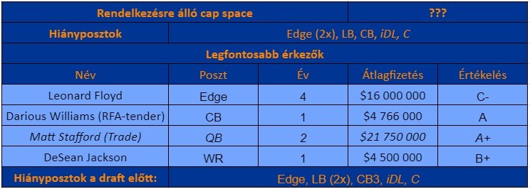 Amennyiben Matt Staffordot nem számítjuk, úgy elég vérszegény a csapat FA-teljesítménye. A pass rusher Leonard Floyd visszaigazolásában van ráció, korrekt szintet hozott Aaron Donaldnak és a rendszernek hála, 10 millió dollárért korrekt lett volna. Az évi 16 milliós fizetés ugyanakkor óriási túlzás még úgy is, ha minden középszerű pass rushert túlfizettek idén. Nem vitás, hogy képes lesz egy korrekt szintet hozni, de ezért a csapat alsó hangon évi 3-5 millióval többet fizet, mint kellene.