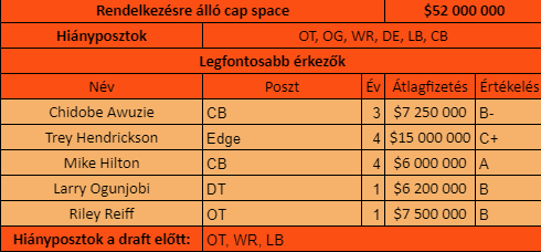A Bengals hosszú évekig nem vette ki a részét a szabadügynökpiacból és főleg a saját embereire alapozott. Ez a filozófia változott meg tavaly és olyannyira belejöttek, hogy idén elég aktív volt a gárda az első pár napban. A nagy aktivitás viszont nem mindig jár eredménnyel is. Nézzük meg ezúttal összejött-e.