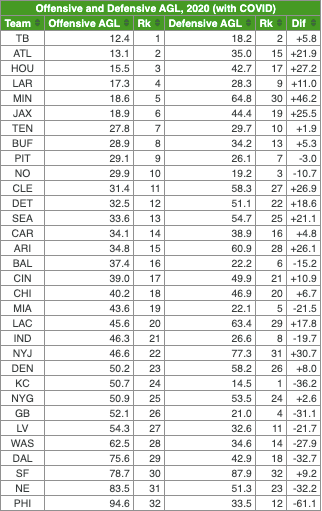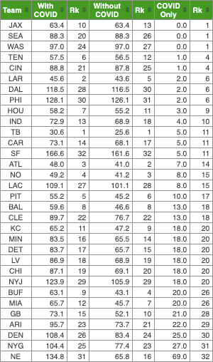 A koronavírus tehát magasan a Patriotsot sújtotta leginkább a szezonban, 67 adjusted games lost került a nevük mellé, míg a második helyen a Giants 27-tel végzett, a harmadikon a Broncos 25-tel. Az opt outokat nem számolva egyébként a Raiders járt legrosszabbul a Coviddal, a szezon közbeni megbetegedések és közeli kontaktok miatt ők szenvedtek a legtöbbet (18 adjusted games lost, a második helyen a Browns és a Ravens 13-mal végzett). Ezzel szemben a Jaguarst, a Seahawkst és a Washington egyáltalán nem sújtotta a vírus.