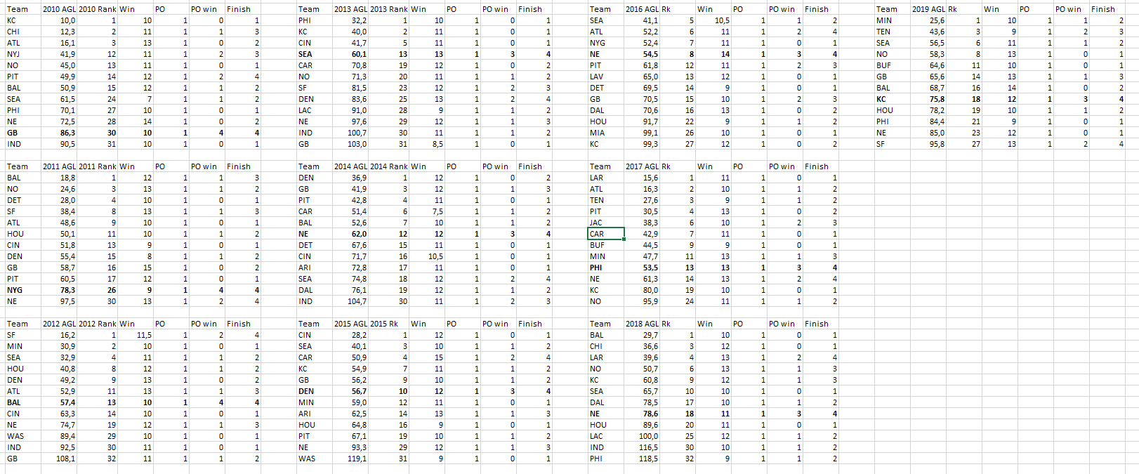 Csapatnéz, AGL szám, Hányadik volt AGL alapján, Hány győzelme volt az alapszakaszban, PO részvevő volt-e (itt mindenki), hány PO győzelme volt, és hol végzett a rájátszásban (1=wild card vereség, 2=divisonal vereség, 3=konferencia döntő vereség, 4 SB részvétel). A megvastagított csapatok a SB győztesek.
