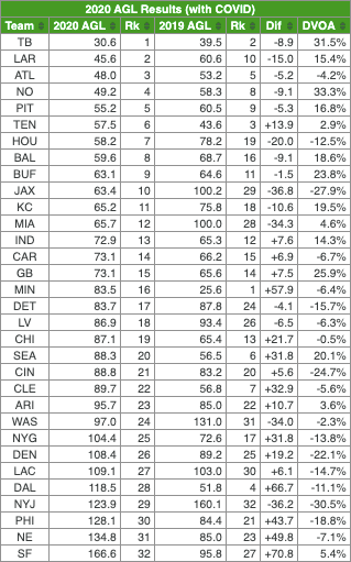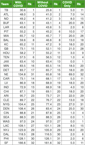 A koronavírus tehát magasan a Patriotsot sújtotta leginkább a szezonban, 67 adjusted games lost került a nevük mellé, míg a második helyen a Giants 27-tel végzett, a harmadikon a Broncos 25-tel. Az opt outokat nem számolva egyébként a Raiders járt legrosszabbul a Coviddal, a szezon közbeni megbetegedések és közeli kontaktok miatt ők szenvedtek a legtöbbet (18 adjusted games lost, a második helyen a Browns és a Ravens 13-mal végzett). Ezzel szemben a Jaguarst, a Seahawkst és a Washington egyáltalán nem sújtotta a vírus.