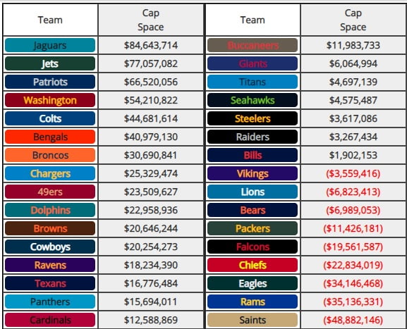 A legtöbb elkölthető pénze a Jaguarsnak van 84 millió dollárral, de a Patriots, a Jets és a Washington is több mint 50 millió dollárral várja a piac nyitását, így ők lehetnek a legaktívabbak az FA elején.