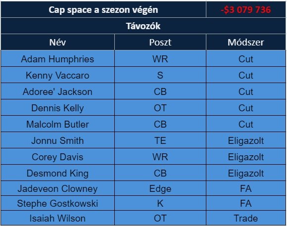 Emellett a Titans elküldte a kezdő RT Dennis Kellyt, míg a szintén kezdő WR2 Corey Davis és TE Jonnu Smith óriásit kaszált a piacon – egyiküknek sincs meg a pótlása. Hozzájuk képest a legendás, de az utóbbi időben inkonzisztens rúgó Stephen Gostkowski, a belső védőfalember DaQuan Jones és a tavalyi évet sérülés miatt jórészt kihagyó Jadeveon Cowney (Edge) elvesztése már fel sem tűnik.