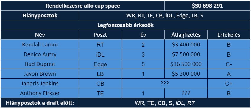 A védelem nem lett jobb, csak drágább tavalyhoz képest, cserébe viszont az offense is gyengül két 10+ milliós játékossal és egy korrekt RT-vel. Ennél sokkal több kell. Értékelés: C