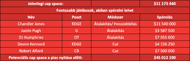 A cikk megírása után érkezett a csapathoz a Houston legendája JJ Watt a védőfalba évi 14 millióért (plusz ösztönzők), ami nem kevés pénz és egyből más szemszögből nézi az ember a leendő és lehetséges igazolásokat/kivágásokat, például így Haason Reddickre biztosan nem lesz pénz, ellenben nem lepne meg, ha Larry Fitzgerald és Patrick Peterson visszatérne 1-1 évre kevesebb pénzért.