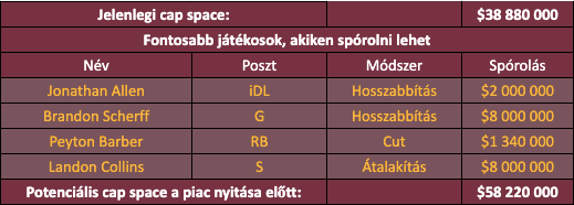 Ténylegesen spórolni egyedül Peyton Barberrel lehetne. Látható, hogy mindössze 1.3 millió dollárról van szó, de a tavalyi évben a snapek csupán 17%-án volt pályán, így felesleges megtartani a nem túl jó képességű futót. Erre a szerepkörre érkezhet bármilyen újonc is majd a McKissic, Gibson duó mögé.