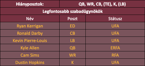 Érdekes, hogy a 4 irányítóból pont a két nagyobb nevű már nincs a csapat kötelékében. Kyle Allen ERFA tendert, Heinicke pedig egy csere irányító szerződést kapott két évre. A csapat a legtöbb ponton rendben van, de meg kell oldaniuk a legnehezebb feladatott: szerezni kell egy irányítót.