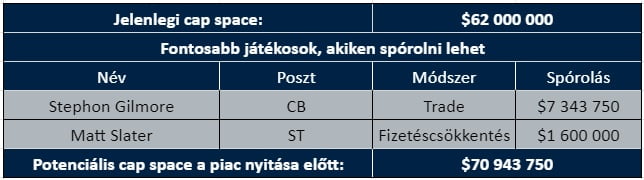 Rajtuk kívül még Marcus Cannonon lehet elgondolkozni, de hozzá mindig is nagyon ragaszkodott Belichick, ráadásul nem is képvisel rossz szintet a fal szélén, 7 millióért nem nagyon lehet jobb játékost találni a helyére. Hacsak nem történik semmi váratlan, úgy 71 millió dollárnyi költőpénzzel vághat neki a piacnak a csapat.