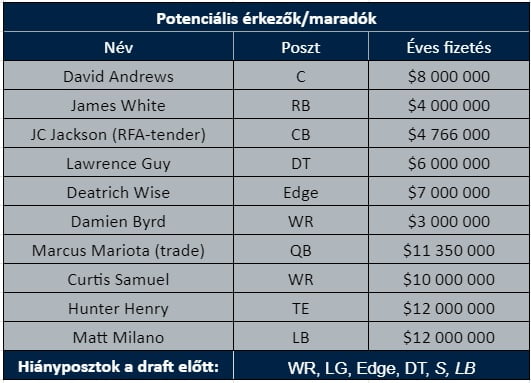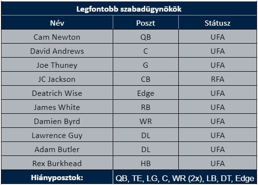 FA-kból nincs hiány, többek között lejár Cam Newton (és Brian Hoyer), David Andrews, Joey Thuney és JC Jackson szerződése is. Emellett az elkapó-, a linebacker-, a tight end poszt és a teljes védőfal erősítésre szorul.