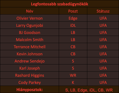 A védőfalban Olivier Vernon jól teljesítményt nyújtott, 51 nyomást generált, de év végén megsérült, így kérdés, hogy egyáltalán a szezon elejére visszatér-e. Ráadásul a 30-at is betöltötte már, és a sérülések korábban is problémát jelentettek számára. Ha olcsón vissza lehet igazolni, az jó, rotációba elfér, de kezdőként már nem számolnék vele. Larry Ogunjobi még csak jól sem játszott újonc éve óta egyszer sem, szóval könnyű szívvel meg lehet válni tőle – ha veteránminimum körül aláír, a rotációba persze elfér. BJ Goodsonnal csak többen vannak a linebackerek, de nem jobbak. Malcolm Smith a jelenlegi állománnyal beférne a kezdőbe, de egyértelmű, hogy az LB-sort erősíteni kell, ráadásul van is pár fiatal a keretben, tehát ő is mehet isten hírével.