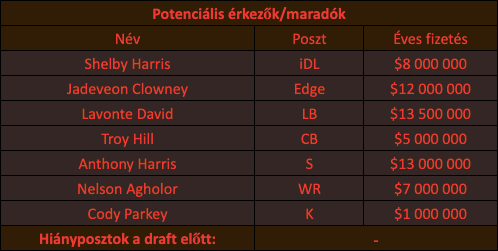 A linebacker sorban felmerülhet a kérdés, hogy érdemes-e nagy pénzeket ölni ide, és sok esetben a nem lenne a válaszom, de ha Lavonte David tényleg kikerül a piacra, akkor érdemes lenne rá beruházni. Pár évig még hozná az elit formáját, mellette mentorálná a fiatalokat is. Állítólag érdeklődik is iránta a Cleveland.