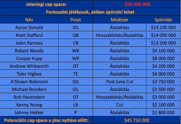 Jó sok átalakítással. A csapat jelenlegi négy legjobban kereső játékosa Aaron Donald, Jalen Ramsey, Cooper Kupp és Robert Woods – mivel mindegyikkel hosszú távon tervez a gárda, így először az ő szerződésükhöz érdemes hozzányúlni.