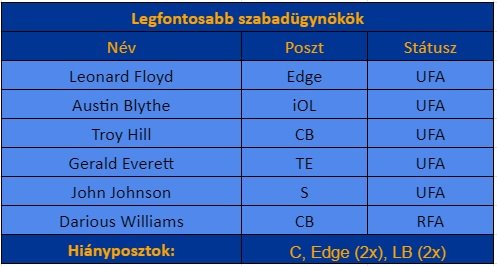 Amennyiben a Rams meglépi a fentebb felsorolt átalakításokat és felszabadít 35-40 millió dollárt a plafon alatt, a határ a csillagos ég. Természetesen lehetne licitálni Shaq Barrettre, Yannick Ngakouéra, Corey Linsley-re vagy bármelyik top FA-ra, de a Bucs sem giga-üzletekkel lett Super Bowl-győztes. A piac tele lesz átlagon felüli, de piaci ár alatt megszerezhető játékosokkal, akikkel mindhárom hiányposzton (C, Edge, LB) lehet segíteni.