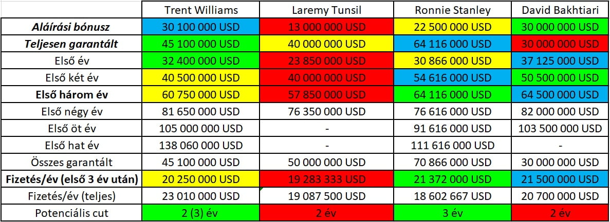 A 2023-as alapfizetést (sárgával) külön ki kell emelnünk, ugyanis ez három különböző tételből áll. Az egyiket már az imént említettem: a 19,4 millióból 1,25 millió dollár garantált. Ezen kívül további 5,5 millió dollár garantálttá válik 2022-ben, és mivel akkor úgysem vágja ki a csapat 32,5 milliós cap hittel, így praktikusan ezt is fixen megkapja (tehát a teljesen garantált tartalom 40,5+5,5=46 millió dollár).