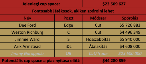 Én most úgy számolok, hogy Garoppolo marad a keretben és talán sikerül draftolni mellé valakit – ez viszont a pénzügyi lehetőségeken nem változtat idén.