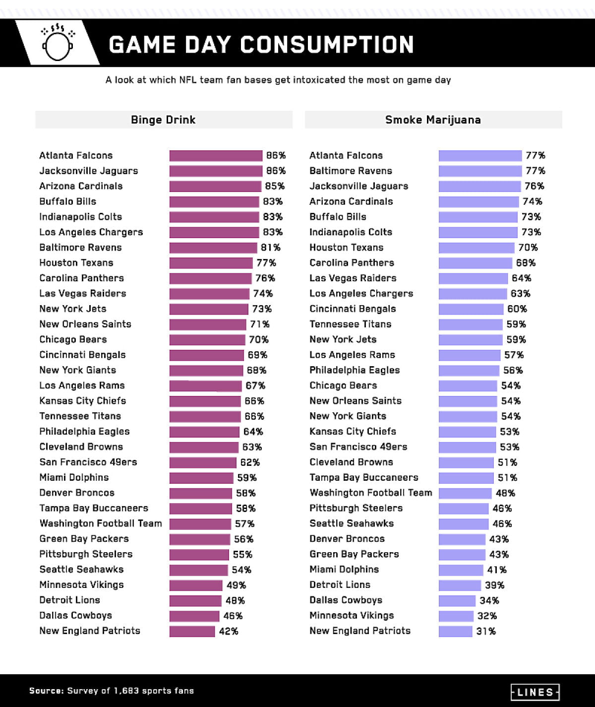E szerint nagy átlagban a nézők 3,7 alkoholos italt fogyasztanak el mérkőzés közben, ha pedig szurkolói csoportokra akarjuk lebontani a bevitelt, akkor a Falcons fanjai lesznek a legillumináltabbak meccsnapon. A szurkolóik közül 88 százalék ismerte el, hogy inni szokott mérkőzés közben, illetve 77 százalékuk azt is, hogy marihuánát is szokott fogyasztani. A lista túlsó végén a Patriots szurkolói foglalnak helyet, mindössze a 42 százalékuk iszik és 31 százalékuk szív.