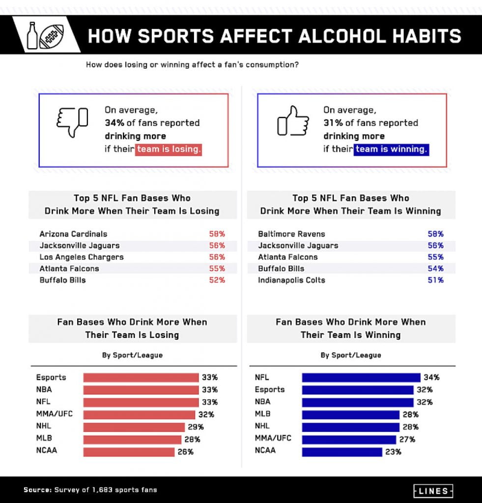 Az is kiderült, hogy az emberek kicsit hajlamosabbak többet inni, ha a csapatuk vesztésre áll – 34% mondta, hogy többet iszik ilyen helyzetben, de 31% épp akkor iszik többet, ha nyernek. A Cardinals szurkolói inkább akkor isznak, ha veszítenek, a Ravensnél pedig több alkohol fogy győzelmek esetén.