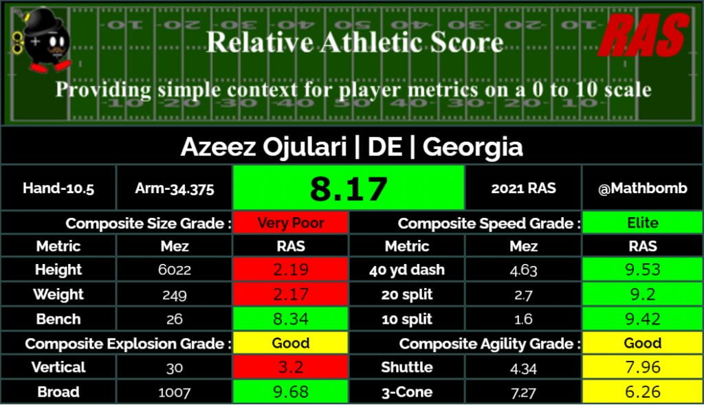 Ojulari játékával kapcsolatban ki kell emelni, hogy az idei edge rusher class egyik legveszélyesebb prospectje nagyon jó hatékonysággal tudja siettetni az irányítót és kifejezetten veszélyes a labdára. Ezt bizonyítja, hogy 2020-ban 9,5 sackjével vezette az SEC-t és országon belül is a harmadik legeredményesebb volt ebben a mutatóban.