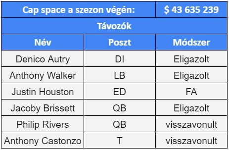 Azt már lehetett tudni a piacnyitás előtt, hogy visszavonul Castonzo és Rivers, a támadósor két alappillére. A többi lejáró szerződésű colt nem képviselt pótolhatatlan minőséget. Autry, Walker és Brissett új állomáshelyén talán több játéklehetőségben és/vagy pénzben reménykedik, egyikőjük távozása sem fáj. Justin Houstonnak még nincs új csapata, visszaigazolása sem kizárt, de a kora miatt bármi lesz a sorsa, meg lehet majd indokolni a döntést.