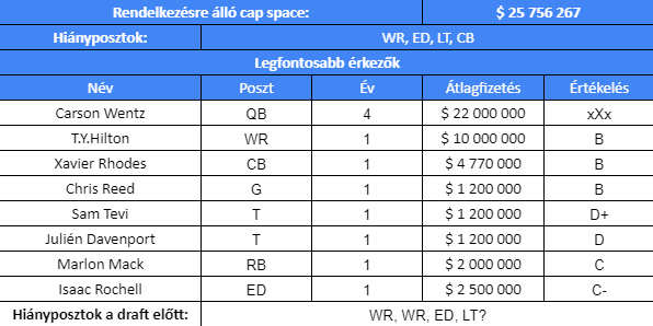 A 2021-es évben minden adott lett volna rá, hogy a Colts lerabolja a piacot, hiszen a rendelkezésre álló tőke az egyik legmagasabb volt a ligában. Indianapolisban nem részegültek ebbe bele, és maradtak a korábbi taktikánál. A szokásos, évi maximum 1 db nagy dobást megtették a Wentz-csere képében, és a várakozásokkal ellentétben ennyiben ki is merült a nagy átalakítások sora. Carson Wentz újjáépítését a helyi erőkkel tervezik, nem hoztak köré további húzójátékosokat. Más kérdés, hogy ez mennyire volt tudatos döntés vagy egyszerű kényszerpálya, elvégre senkit sem lehet kötelezni rá, hogy aláírjon, jobb anyagi feltételek ide vagy oda.
