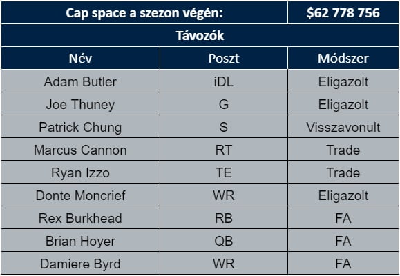 Donte Moncrief és Damiere Byrd WR3-4 szintű játékosok. Utóbbi még akár vissza is térhet veteránminimum közeli összegért, de összességében egyikükért sem kár. Brian Hoyer még Jarrett Stidhamhez képest is visszalépés, jó eséllyel vissza is vonul lassan, míg Ryan Izzóból nem lett az új Gronkowski (a tavalyi TE-draft nagyon mellé ment). Mellettük még Marcus Cannon távozott, akiért pár hátsóbb körös picket megcserélt a Texans és a Patriots – ő kezdő szint, de tavaly opt out miatt nem játszott, illetve érkezett a helyére pótlás, így nem keletkezett űr utána.