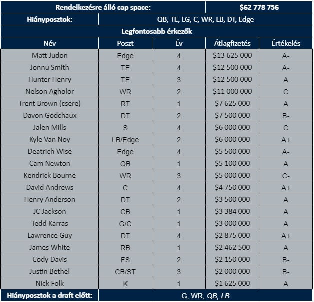 A Patriotsnak a szezon végén 62 millió dollárnyi cap space-e volt, így nem kellett kivágásokkal foglalkozni. Ellenben lejárt többek között Cam Newton, David Andrews, Joe Thuney, JC Jackson vagy Lawrence Guy szerződése, és az ő pótlásukon túl még meg kellett volna erősíteni a TE, a WR, az LB és az EDGE pozíciót is.
