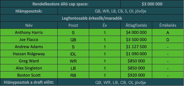 Az Eagles pontosan azt csinálta, amit vártunk tőle: átalakított egy csomó szerződést, elengedte a ballasztot és szinte nem igazolt senkit. Mivel lehetősége sem volt a csapatnak semmire, így értékelni is nagyon nehéz ezt a piaci tevékenységet, a kötelezőt hozta a franchise, logikus döntéseket hozott, ami mondjuk egy C+ értékelésre lenne jó, ezt dobja meg Anthony Harris bagóért történő leigazolása, majd ezen csökkent a Flacco túlfizetése.