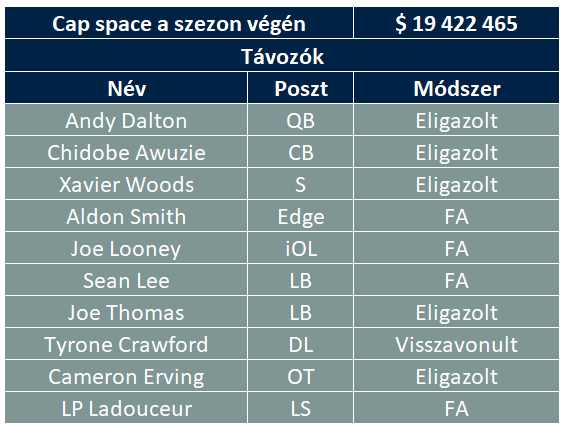 Hosszú névsorral vágott neki a Cowboys a szabadügynök piacnak, de egy kivétellel csak olyan játékosok szerepeltek a listán, akik könnyebben pótolhatók. Várható volt, hogy nagyobb jövés-menés lesz, főként a védelemben, több, korábban meghatározó játékost el fog engedni a csapat. Ez nem is történt másképp, a távozók között azokat a nevekkel találkozunk, akikről sejteni lehetett, hogy máshol fogják majd folytatni.