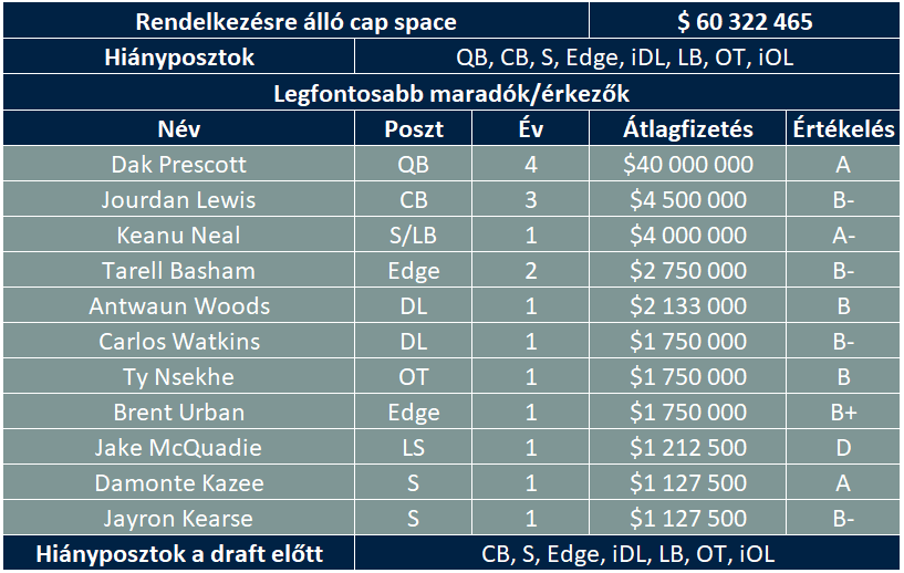 Mindent egybevetve, a csapat a legfontosabb dolgot gyorsan és hatékonyan elintézte, Prescott aláírt négy évre, amivel kapcsolatban jó érzései lehetnek a csapat szimpatizánsainak. A tavalyi szezon tökéletes példa volt arra, hogy Prescott nélkül nem halad előre a csapat, jelenlétében pedig különleges dolgokra lehet képes a támadósor. Azzal pedig, hogy ő ekkora szerződést kapott, a többi tevékenység szűk keretek közé lett szorítva, viszont így is sikerült a zavarosból egy-egy szebben fénylő halat kifogna a felsővezetésnek, Neal és Kazee érkezésének kifejezetten lehet örülni, de az apróbb mélyítések is rendre jó értéken történtek. Az egyetlen dolog, ami keserű szájízt okozhat, az a Ladouceur-McQuadie csere, de szakmailag ez is egy védhető döntés, abban az esetben, ha sikerül a Ramstől érkező veteránból makulátlan teljesítményt kicsikarni.