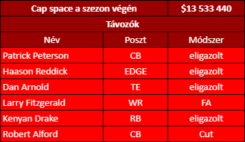 Hiába ment el a 2010-es évek ikonikus cornerbackje, Patrick Peterson, nem fog nagyon hiányozni az elmúlt két év teljesítményét látva, de lehet, hogy Minnesotában új erőre kap, és ki tud harcolni magának egy utolsó nagyobb szerződést. Haason Reddick távozása meglepett, de Keim valószínűleg úgy gondolta, hogy egy jó év kevés a nagy pénzhez, és a helyét be tudják tölteni a többiek (Golden, Gardeck), plusz egy egészséges Chandler Jones. Kenyan Drake elment a Raidersbe jó pénzért, ő is könnyen pótolható, csakúgy, mint Dan Arnold, Robert Alfordot pedig végül visszahozták veteránminimumért.