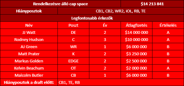 Látványosan, de nagyon kockázatosan építkezik a Cardinals, a cél viszont adott, irány a playoff, különben viszlát Kingsbury. Ha idén csak a rájátszás lesz meg, de ott egyből kiesnek, akkor még 2022-ben is lehet próbálkozni, de utána már Murray-nek is szerződést kell adni, és Watt sem lesz fiatalabb. A távozókért nem kár, a drafton pedig lehet hozni további célpontokat Kylernek, a szerződéseket pedig úgy alakították, hogy még mindig közel 14 milliója van a plafon alatt a csapatnak, így még egy-két veterán is érkezhet a következő hónapokban, akár Larry Fitzgerald is visszatérhet még egy évre. A teljes képhez hozzátartozik, hogy Justin Pugh és Jordan Hicks is belement egy fizetéscsökkentésbe és Devon Kennard június 1. utáni kivágásával is lehetne 6 milliót spórolni.