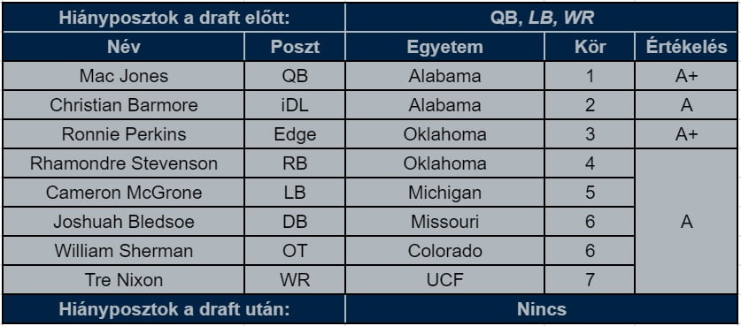 A Patriotsnak nem volt rossz pickje. Nem kellett egyetlen cetlit sem feláldoznia egy potenciális franchise irányítóért, némi áldozatért cserébe behúzta a class legjobbjának tartott DT-jét, szerzett pár stealt a védelembe és javított egy kicsit a futóposzton. Mac Jonesba, mint játékosba talán bele lehet kötni, de ennek sincs sok éle, a csapat meglépte azt, amit többek között a Broncos vagy az Eagles nem mert. Ez a draft csapatépítési filozófia és a játékosok nettó értéke alapján is top 3-as. Értékelés: A+